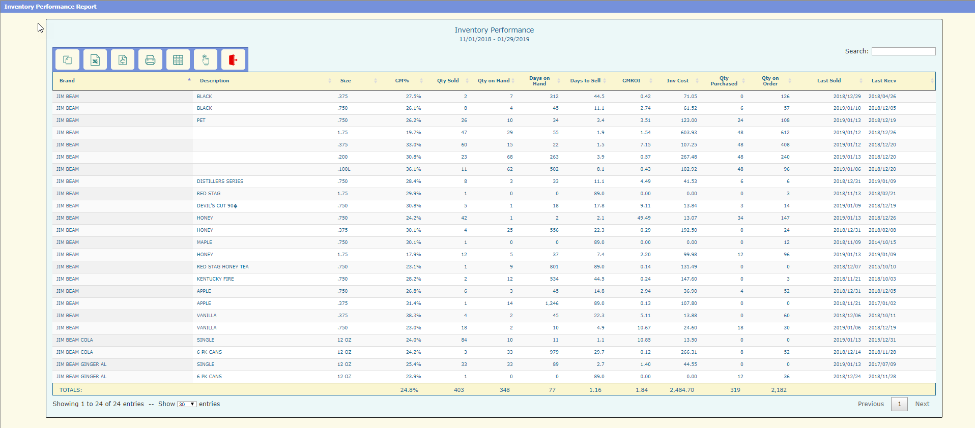 Inventory Performance Report: This report allows you to look at the performance of your inventory by Brand, Department, Vendor, Description, Type or Size for any historical period. Drill through to actual invoices and receivers. What makes this report extra special is that it uses the sales data for that period to calculate Days on Hand, Days to Sell and GMROI. Finally, Forecasting for LiquorPOS®!!
