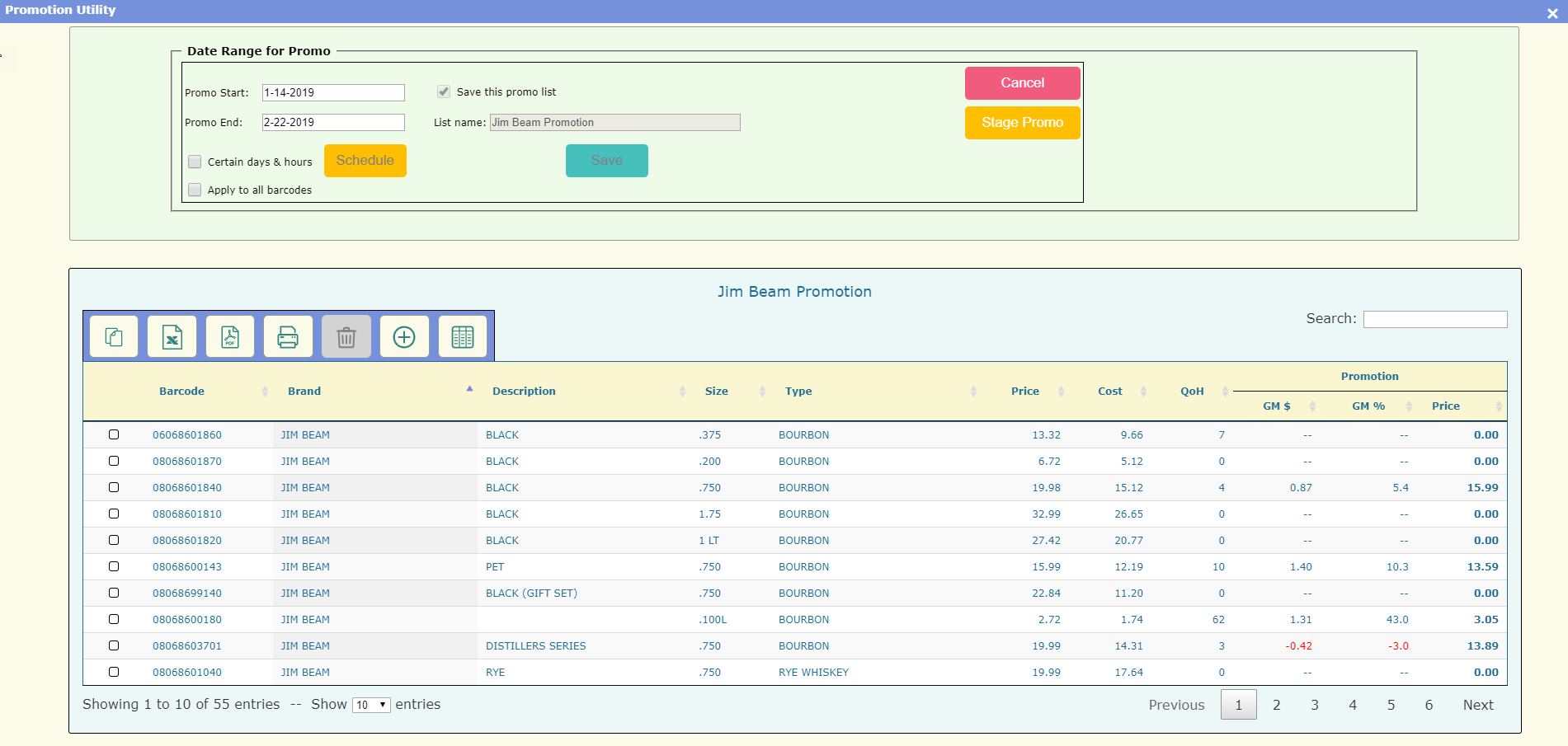 Promotion Utility: This cool new feature utility allows you to create, save and stage promotions for LiquorPOS. The idea is to be able to create a group of items you wish to put on sale, have all the information you need to determine which you do want to put on sale and at what price, be able to enter that pricing and have EncorePOS enter the promo price into the correct fields in LiquorPOS and then export your final list to Excel for use in any advertising or marketing materials you would like. The Utility will save any work in progress as well as save finished promotion lists for future use. The Stage feature allows you to create and save a promotion and have it automatically begin on the desired date.